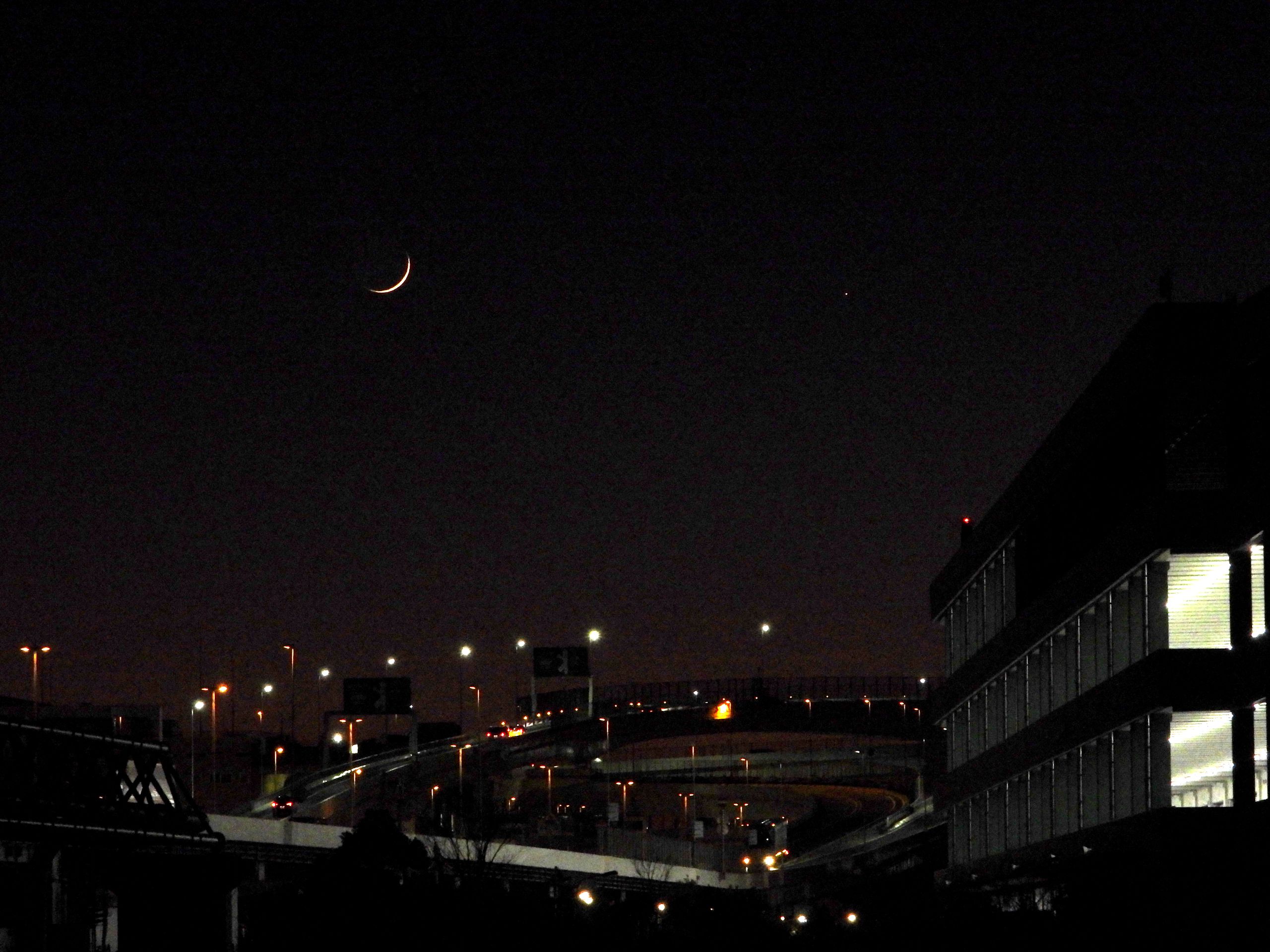 高速道路の立体的な交差の上に月と水星、帰り途でしたのでそのまま構えてパチリ。固定撮影すれば良かった。COOLPIX P1000 2022/01/04 17:29 ISO-800 f/6.3 28mm(155mm相当) 1/40秒