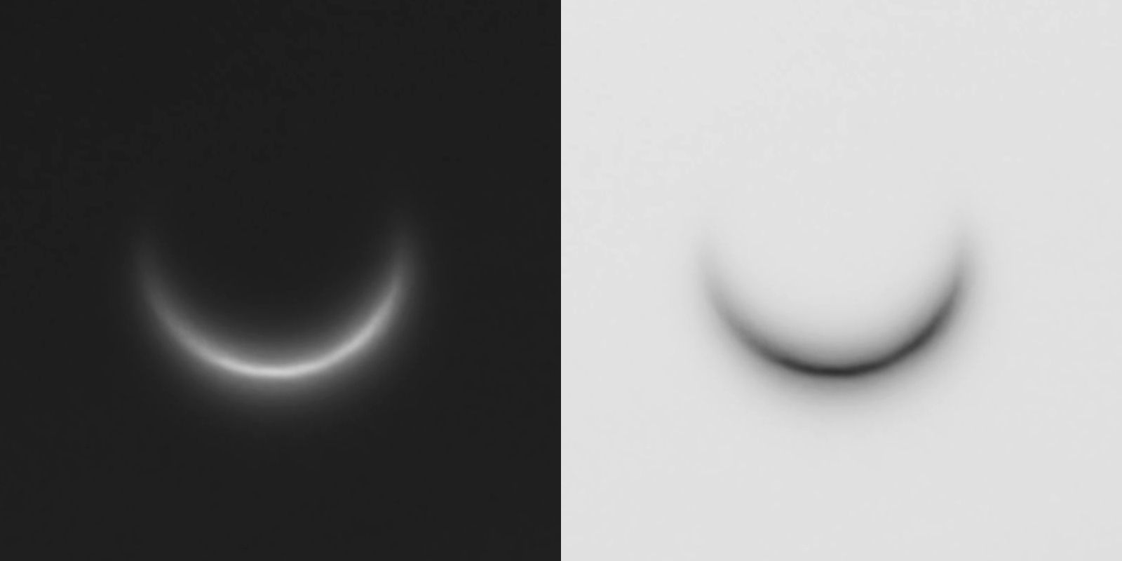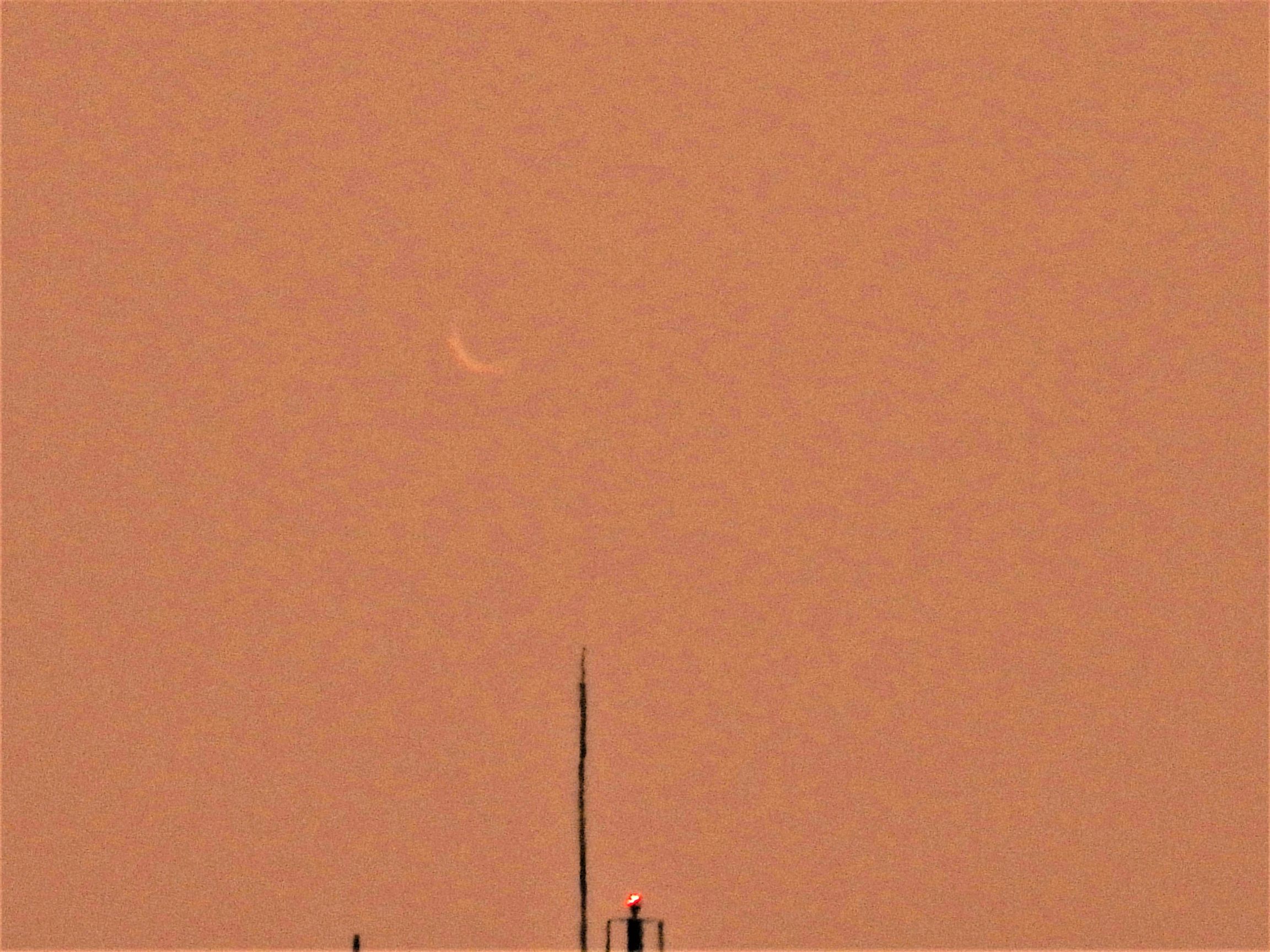 「ほんのり光房」様では偶然にもほぼ同じ時刻に撮影した望遠鏡による画像が掲載されていました。正確に向きを調整されていますので輪の光る領域はやや左下になっています。ここでの画像は撮ったままの画像です。そのクリアな望遠鏡写真ではカスプが180°以上になっていることが報告されていますが、COOLPIX P1000の画像では180°程度でしょうか望遠鏡並みには写っていません。